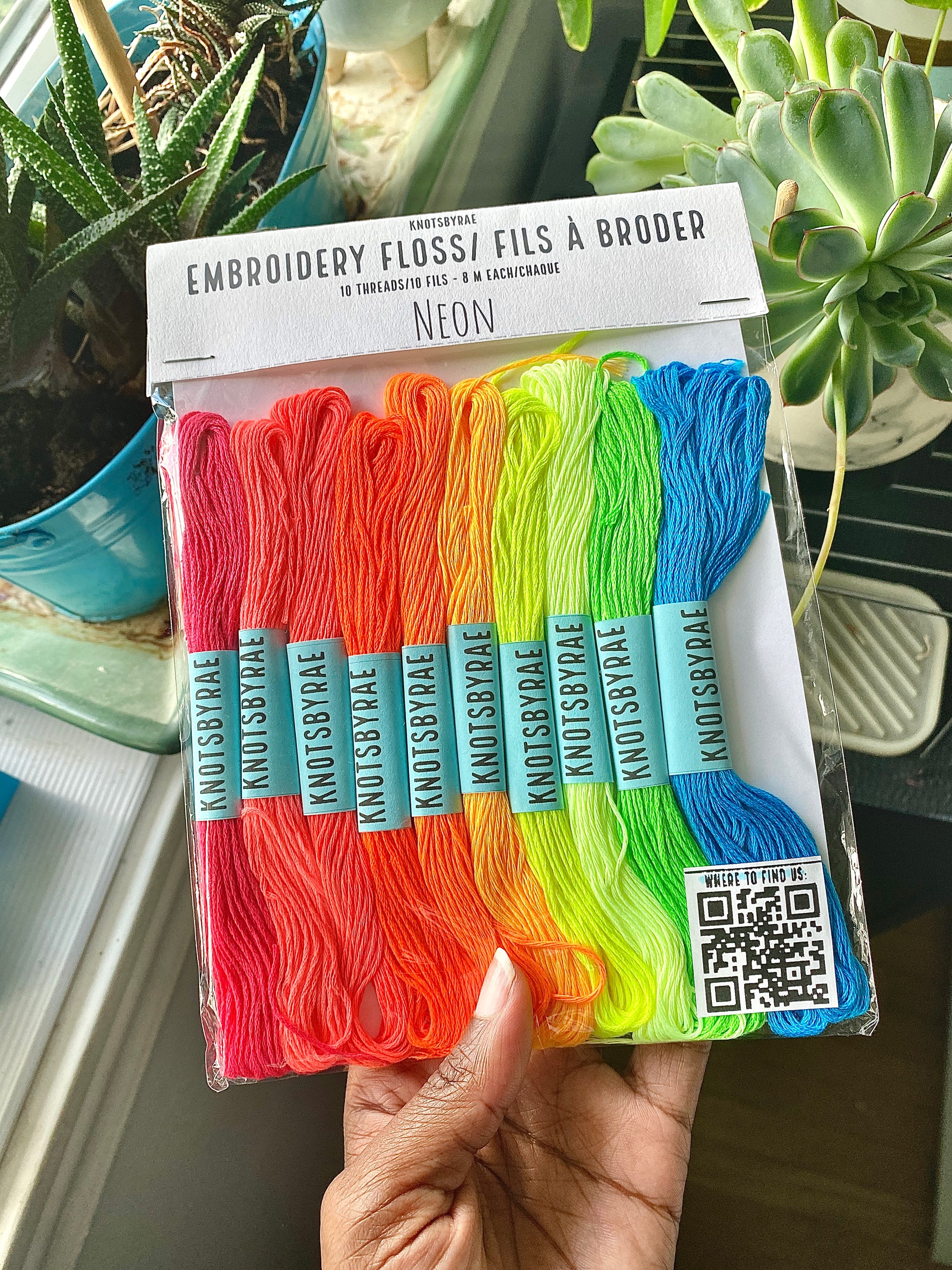 10 skeins of Neon embroidery threads. The listing is for 1 individual skein of floss or a pack of 10. Each pack of 10 includes varying shades of Pink, Orange, Yellow, Green and Blue.