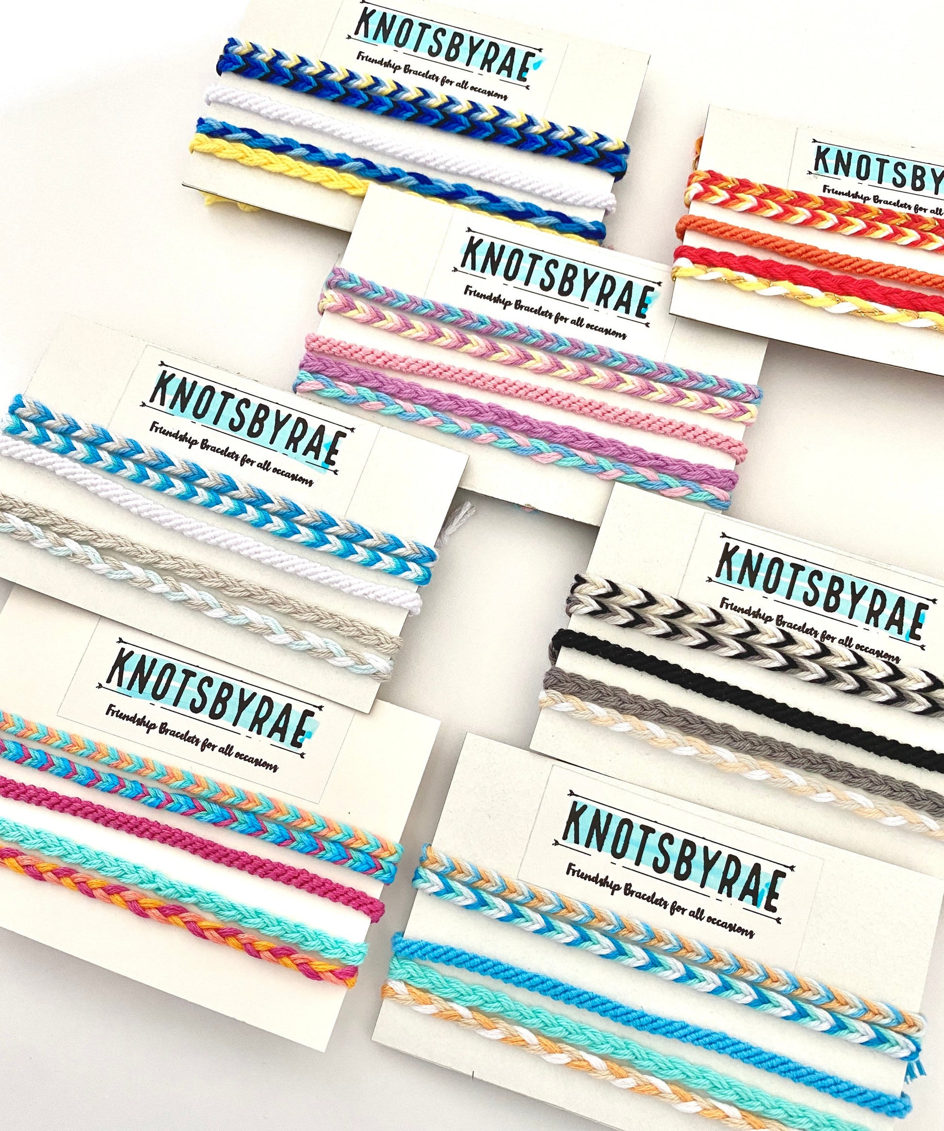 A set of 5 colourful friendship bracelets for yourself, or to share with your friends! Each set comes with specific colours and cannot be mix and matched. If you would like a custom set, email me!