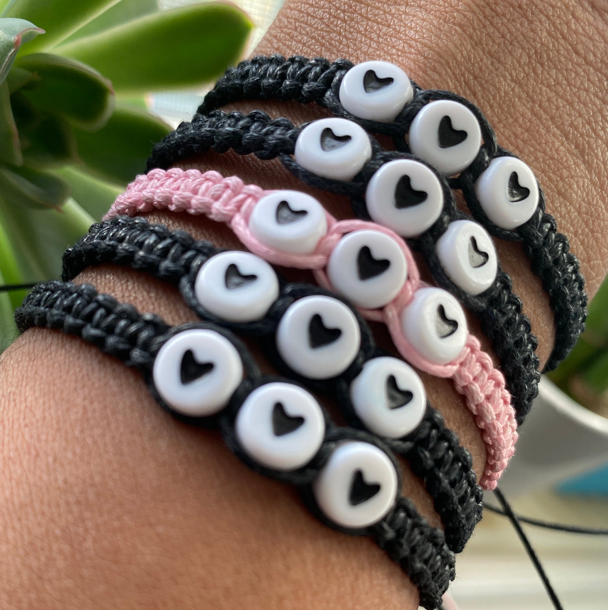 Spread love and friendship with our Custom Heart Macrame Bracelets! Perfect for any occasion, these hand-crafted bracelets feature heart-shaped beads and durable waxed cotton cord. Share the love with a unique and personalized gift for your friends and loved ones. They are all handmade using square knots and with an adjustable knot tie.